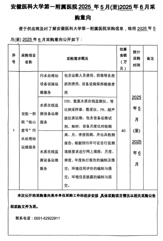 安医大一附院“临山壹号”污水处理站运维服务项目采购意向公开